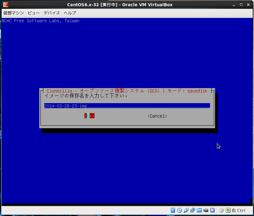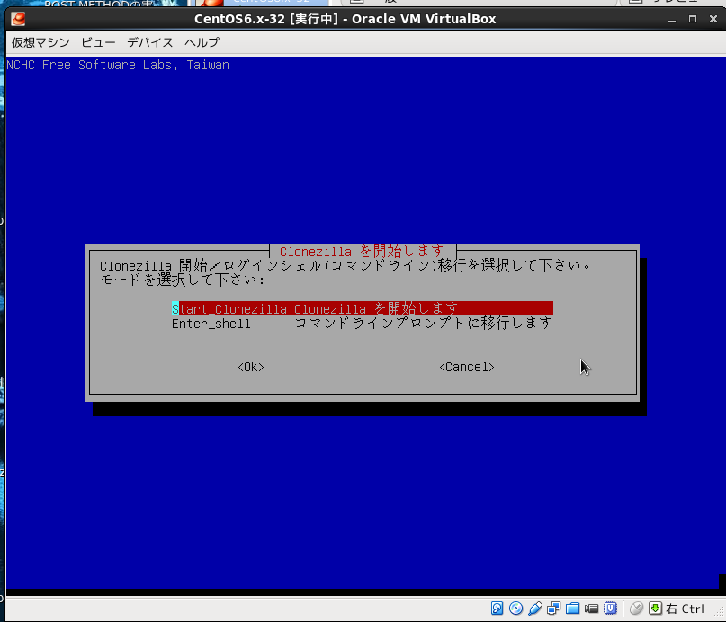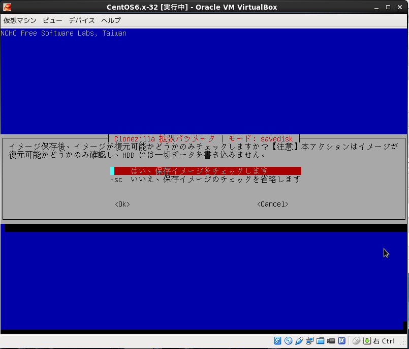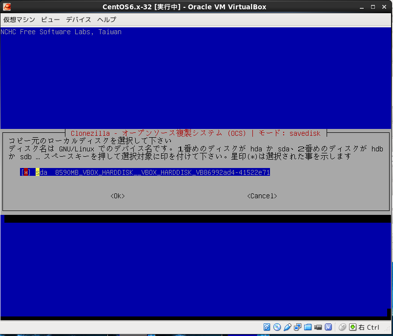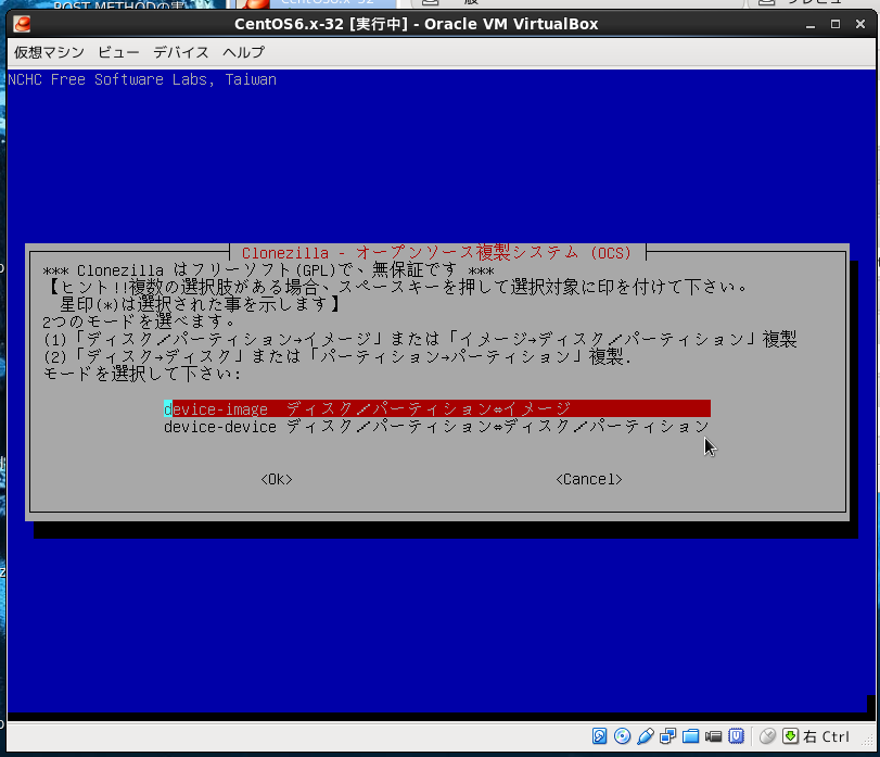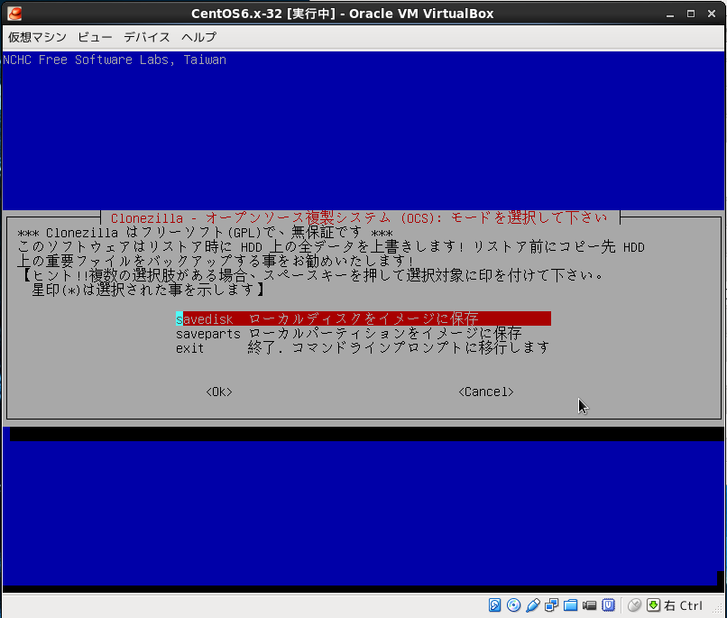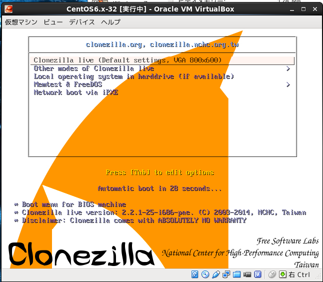 Virtualboxの設定で仮想PCのDVDドライブにclonezillaのisoイメージ設定して仮想PCをブートさせる。