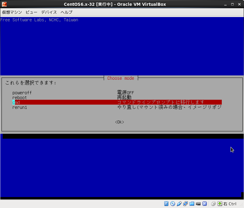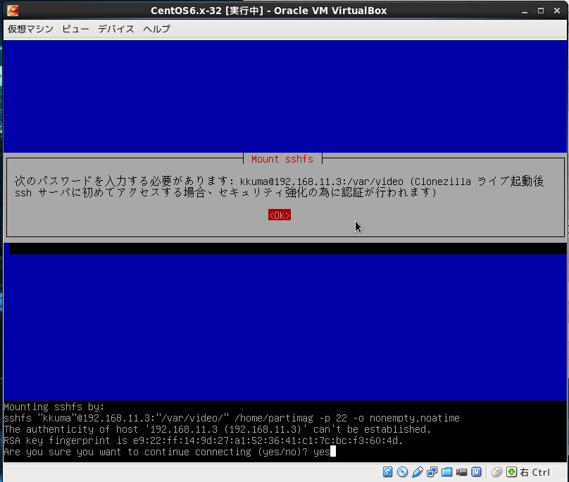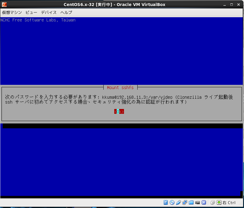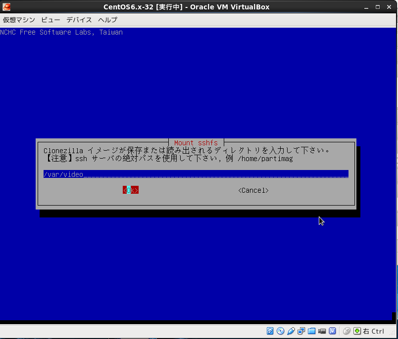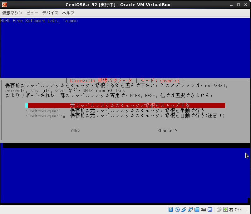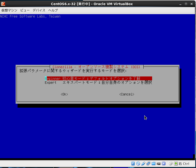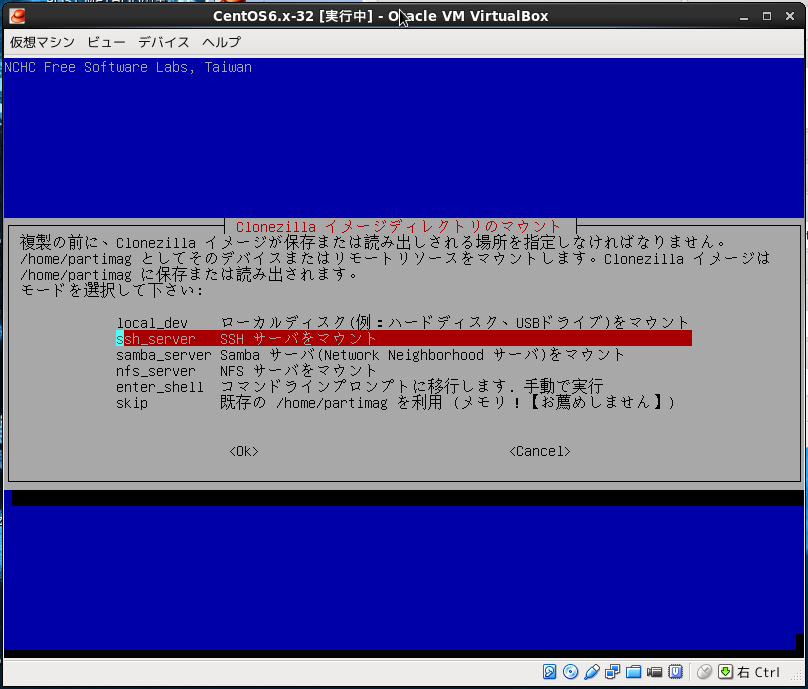 Virtualboxの設定で仮想PCのDVDドライブにclonezillaのisoイメージ設定して仮想PCをブートさせる。